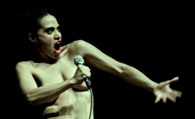 The pain we experience is that of an unnamed woman, perched high on a platform in the centre of Summerhall’s gloomy Demonstration Room. As played by the astounding Silvia Gallerano, she is naked in every possible sense of the word, bare save for a slick of blood red lipstick. Microphone clutched in hand and limbs protectively folded, she speaks with startling directness, nothing to separate or shield her performance from the audience other than the few metres of air in between.