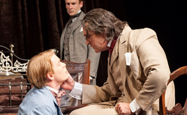 The two biographical turning points on which Hare has chosen to focus are the lead-up to Wilde’s arrest for “indecency”, when he refused to take the opportunity to flee the country, and his time in Naples with Lord Alfred “Bosie” Douglas after his release from prison. Wisely avoiding any attempt at a comprehensive overview of Wilde’s life, these are precisely selected moments, moments seemingly characterised by stasis and apathy – qualities frequently attributed to Wilde by his friends and reflected in Everett’s almost constant anchoring to a chair – but in fact involving deeply revealing decisions on Wilde’s part. Ultimately, his failure to leave the country is framed not as an act of lethargy, but as an act of love and a stubborn refusal to bow to the hypocritical morality of the English aristocracy.