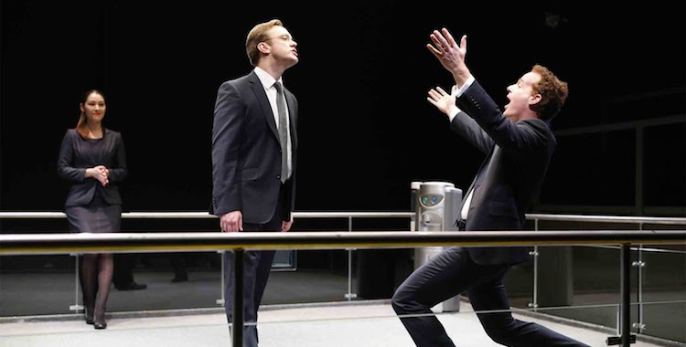 In the Young Vic’s taut production, this all unfolds in swift but tense fashion. Lizzimore directs the cruel back-and-forth at a machine-gun rattle, occasionally punctuating the rapid dialogue with precise, painful silences. The verbal equivalent of a staring contest, it’s all about who snaps first. That person is, inevitably, Sam Troughton’s tightly wound, helplessly jittering Thomas, a man on the verge of eruption. As his opponents, Adam Jones and Eleanor Matsuura are hard and shiny as glass, the former doing battle with superficial mateyness, the latter with icy manipulation.