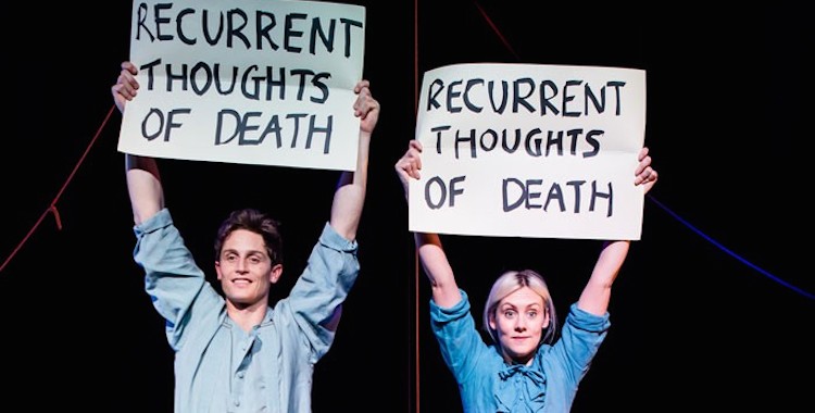 The love story itself is also silly in the telling, cute and self-mocking in equal measure. Bryony and Tim collide, literally and metaphorically, their lives unexpectedly smashing into each other. Their early romance is almost childlike in its sweetness, played out in cartoonish smiles and dorky dance moves, and when the couple move in together they drape a tent across the stage like a kids’ den. When Bryony discovers Tim’s anti-depressants, then, it’s with a rude jolt. The illness that he has kept secret for years disrupts the bliss of their shared life, injecting the romance with darkness but also with honesty.