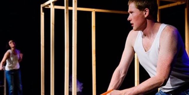 As Katherina takes us on this ironic journey through recent history, to a soundtrack of era-appropriate tracks from Dire Straits and Pulp, Alister is working on his own DIY project behind her. While she talks, he builds, first assembling the wooden skeleton of a shed, then constructing a makeshift wall from the logs scattered across the stage. His masculinity is recovered through the act of erecting a border. At odd moments, meanwhile, the action is punctuated by quiet, dimly lit monologues from Alister: seemingly random interruptions that resolve themselves into subtle blows at political rhetoric.