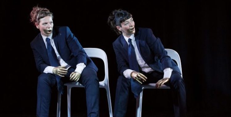 Cade is soon joined on stage by fellow performers and co-creators Nic Green and Laura Bradshaw. All three are in identical suits with identical gold hands and identical gold mouths. And when I say gold, I mean gold. Think woman-on-the-bed-in-Goldfinger gold. Shimmering, uncanny, this golder-than-gold paint makes strange the organs of communication. Later, it rubs off on clothes and skin, leaving grubby, oily marks.