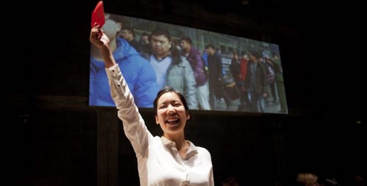 As we take our seats, Lucy Jane Parkinson’s Joan of Arc is a smiling, awkward bundle of nerves. This warrior and saint-to-be rounds her shoulders, crosses an arm protectively across her chest, sneaks furtive, sideways grins. She’s uncomfortable in her own skin, itching to shrug it off.