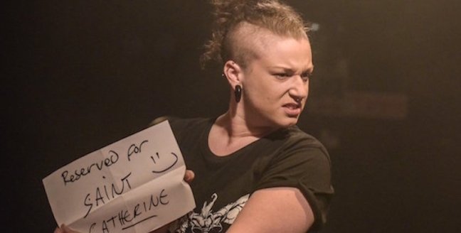 And like Ira Brand’s remarkable Bruce Springsteen performances in Break Yourself, JOAN is also a stunning bit of drag. Parkinson (herself a drag king champion) transforms into a series of very different men – Joan’s father, the Dauphin of France, the judge presiding over Joan’s trial – with little more than a change of jacket and the application of facial hair. But she also demonstrates how all gender is, at root, performance. Early on, it’s with humour, as she stuffs her bra down her shorts and struts around imitating the walk of a game male member of the audience. Later, as Joan is ordered to renounce cross-dressing or lose her life, it’s with a painful straining towards stereotyped femininity.
