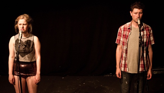 Intertwining those two strands of betrayal – personal and political – is a brilliant idea. First disappointments are always the harshest, and so the slow, painful process of losing faith in parents is a compelling analogy for losing faith in the left. In practice, though, the two halves of the show don’t ever fully knit together. As Cheryl and Tess speak into their microphones about the promises of men in suits with footage of Blair rolling behind them, it’s clear what TheatreState are doing, but this basic conceit isn’t really advanced at all over the course of the show. Instead, the two performers’ family relationships begin to dominate, taking us further and further into the personal while the political lingers like a half-forgotten shadow.