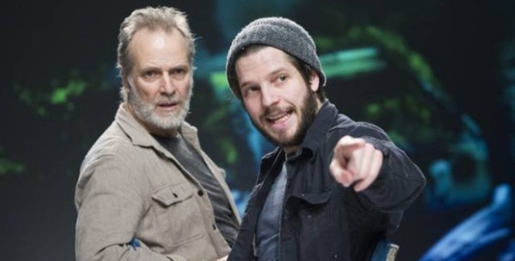 What becomes clear as the piece unfolds is that the play has been constructed from a combination of the two men’s words, drawing on their long email correspondence, their eventual meeting in the Arctic, and other documentary materials. This is all compellingly delivered by just two performers: William Gaminara as “Paul” and Damien Molony as “Dan”, with both also standing in as the large cast of supporting characters (although Gaminara and Molony effectively portray Watson and O’Brien respectively, they are of course distanced representations of real people, so let’s just assume the quotation marks from here on in). The Body of an American is, essentially, a verbatim show.