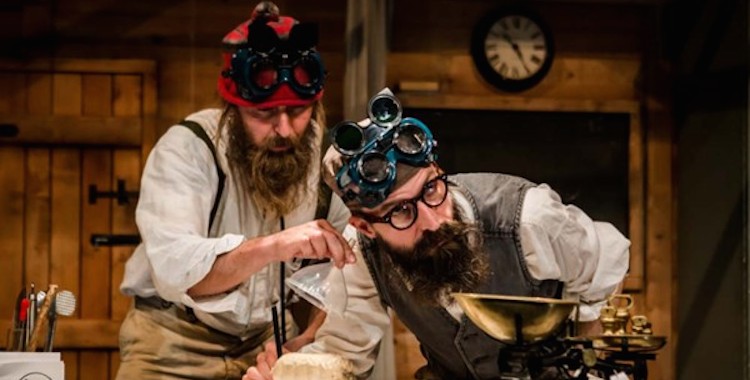 For reasons never made clear, the two men are away from home, holed up together in a shed in what appears to be a cruelly inhospitable landscape. We first see them in bright yellow protective gear, retrieving and proceeding to conduct experiments on an unresponsive, haggis-shaped object. We are instantly in the realm of physical comedy, with performers Jamie Wood and Tom Lyall making a sublimely silly double act. They poke, they prod, they throw. The subject of their experiment is rolled, jabbed, sent into the air with a mini parachute – Lyall even tentatively licks it. The lab isn’t all that different from the playground.