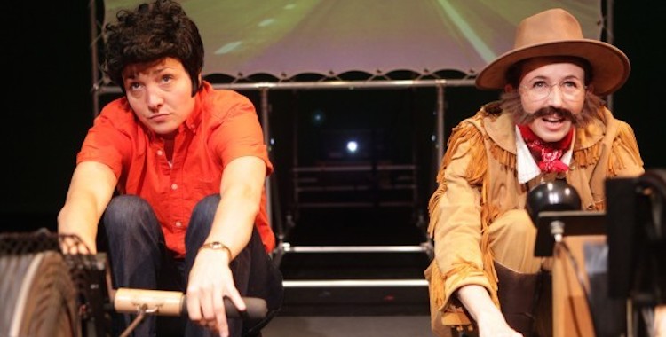 This all takes place within a makeshift film set, surrounded by screens playing snippets of Thelma and Louise and a series of movie-like on-location scenes, gorgeously filmed by Andrew Schneider. There’s more than a hint of The Wooster Group to this ubiquitous presence of televisual media, as movies become absorbed into the texture of everyday life. Thelma and Louise is a thematic and aesthetic reference point throughout, in fact, its simultaneous homage to and subversion of the road trip buddy comedy providing a blueprint of sorts for The TEAM. Here, again, two women critique the centrality of very particular ideas of masculinity to the American psyche – only these two women are playing two men.