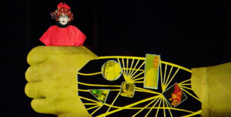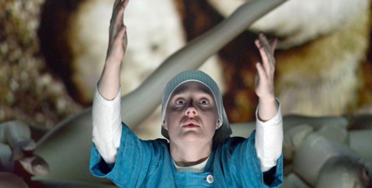 Aside from all the dolls, the most striking aspect of Miriam Buether’s design is its allusion to the fiery and fantastical imagery of medieval religious painting. The back wall of the performance space, periodically sliding aside to reveal the police cell where justice is clumsily meted out, is laid out in three panels like a triptych altarpiece, projected both with scenes from Christian paintings and live streamed video of the performers (now something of a European-flavoured Hill-Gibbins trademark). In one scene, we see a close-up of Claudio’s desperate, pleading face; in another, a cackling painted devil.
